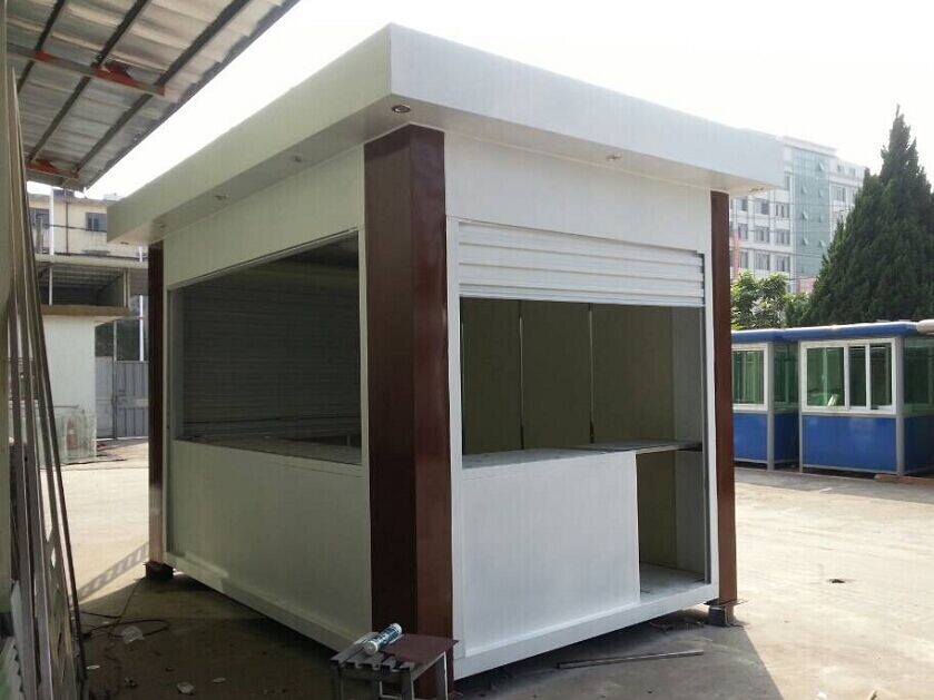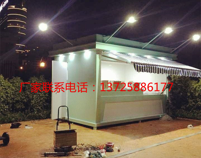 多功能售货亭尺寸:5.0*3.0*3.0米,侧面开门,正面卷闸门关闭,侧面有个广告灯箱。