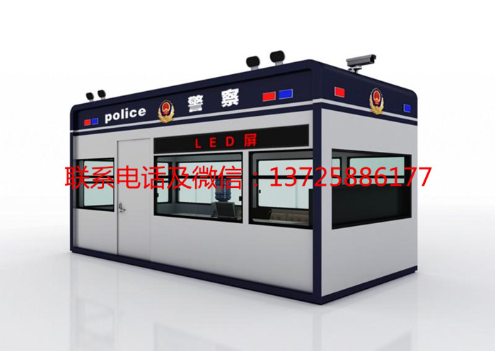 警务室外围字体采用大型的水晶字,采用实体标准的警徽,外面四周墙体安装红、蓝LED闪闪发光的专用灯,顶部四周角落上安装了专用警灯,整个警务室岗亭采用钢结构焊接,双层顶部结构有很好的散热功能,警务室岗亭就像坚固的堡垒安置在那,保护着整个区域秩序及安全。