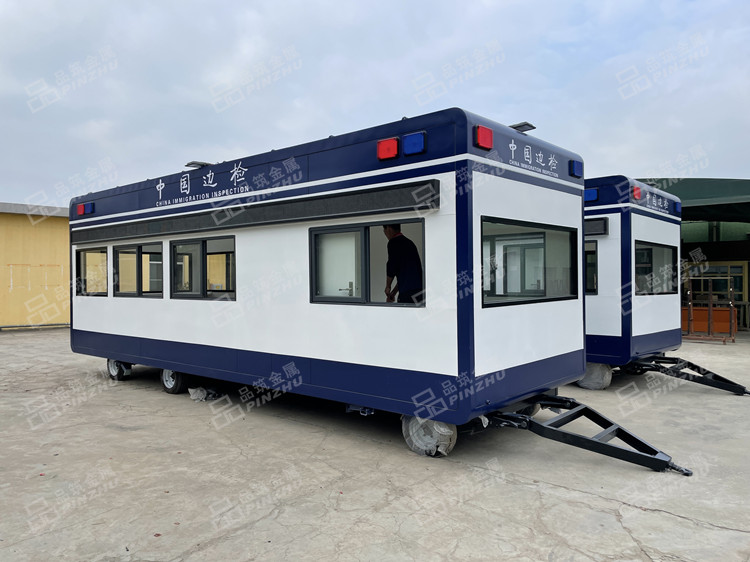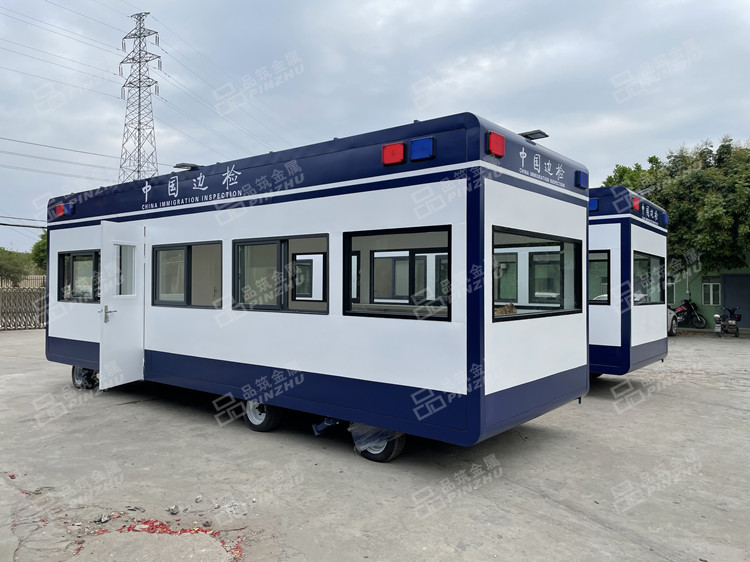 东莞市品筑金属制品有限公司最近制作中国边检移动警务室,此移动警务室为常规款式,内部按照常规标准配置,此移动警务室是免费提供给公安执勤的警察叔叔使用,这移动警务室也成为整个中国边检的一个重要的警务执勤点。下面先来看看厂家生产的移动警务室产品: