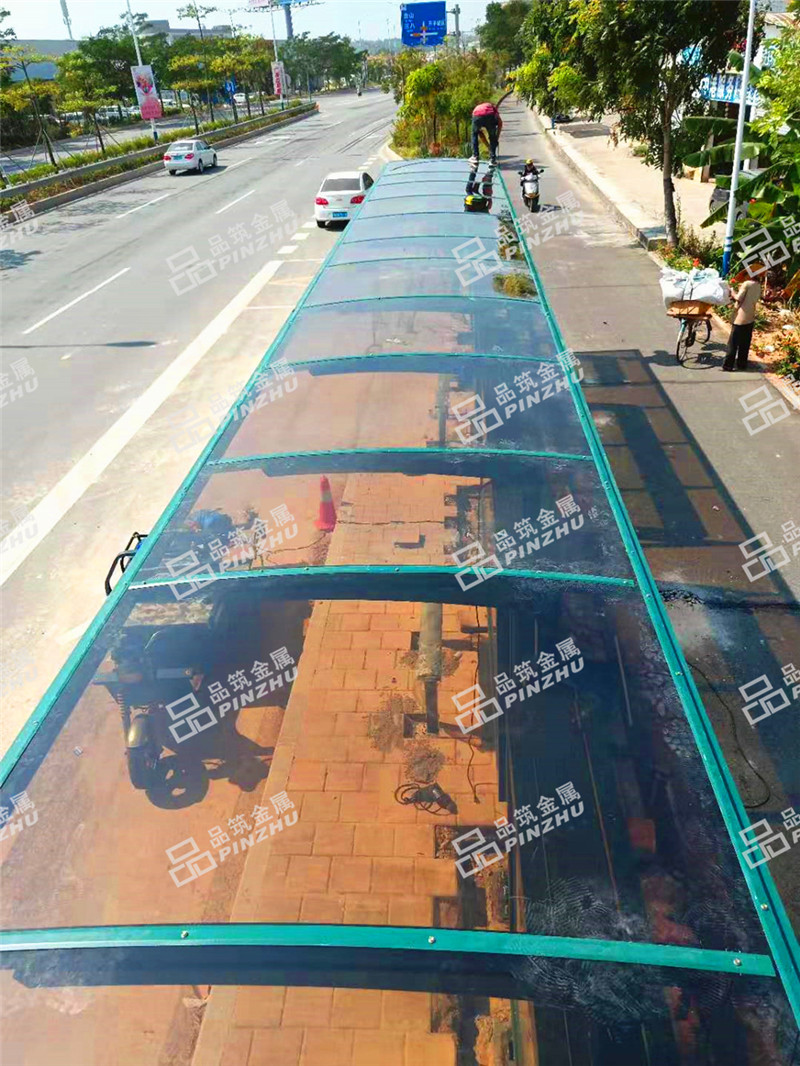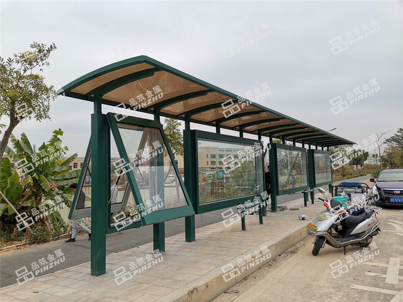 候车亭顶棚材料:5mm茶色耐力板。候车亭顶弓材料:采用3mm钢板激光切割焊接成型。候车亭立柱:150*150*3mm碳钢方柱。灯箱配置为三部分:内胆:采用1.5mm镀锌钢板钣金制作成型外盖:采用双层1.2mm镀锌钢板钣金制作成型,玻璃为8mm钢化玻璃。电器:节能灯管或LED灯、漏电开关、时空开关、滚动装置。