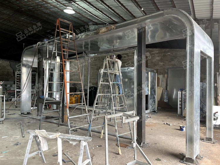 广州增城候车亭,此为样板候车亭,长度8米,宽度2米,高度3.0米,由东莞市品筑金属制作有限公司承建,现已经投入使用,以下是候车亭效果图及生产图片: