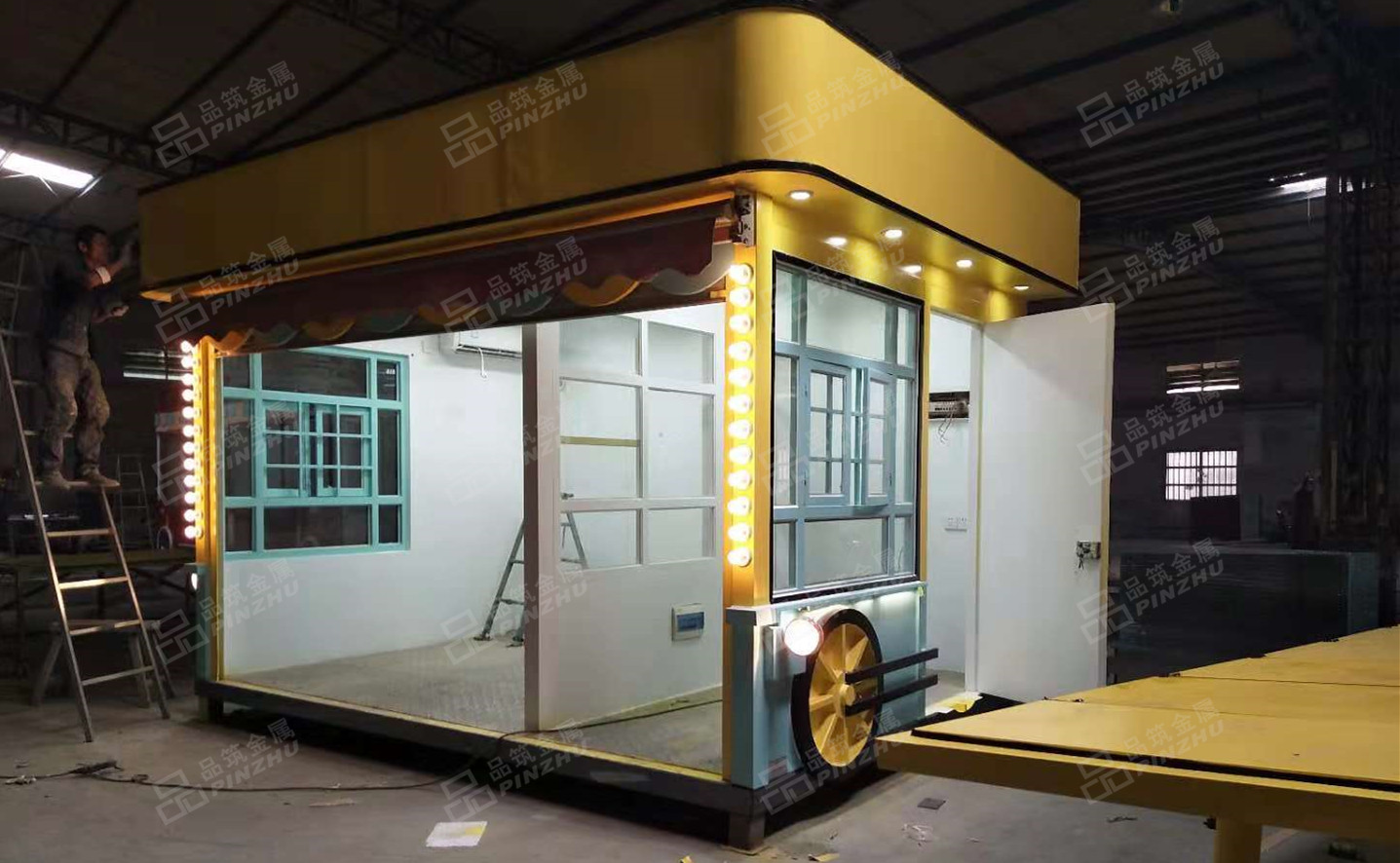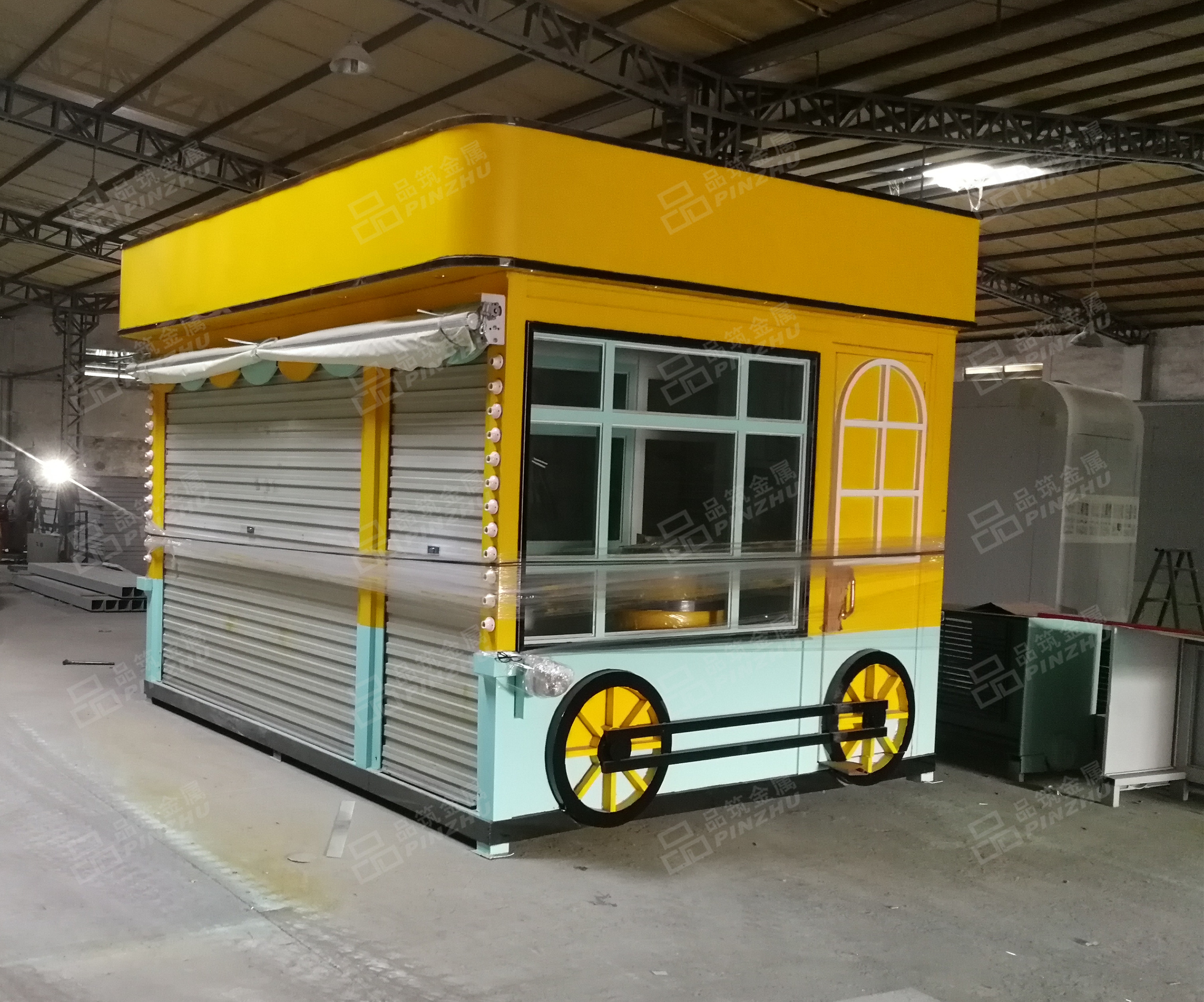 早餐亭内部工作台均为不锈钢材料制作,侧面开门,主体钢结构焊接方便吊装及叉车搬运。