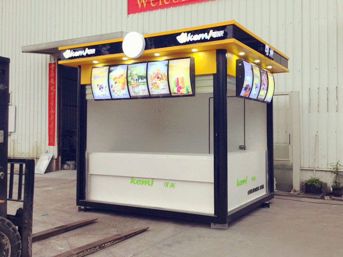 此售货亭最大特色是两边各有一个发光的装饰L字灯箱,晚上是一个很大的亮点,内部安装LED模组发光均匀,亭子结合广告装饰,让整个亭子凸显个性,此售货亭用来卖奶茶,特色小吃,工艺品等。