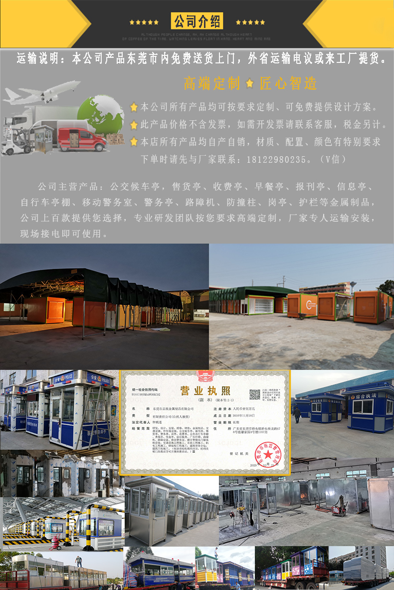 东莞市品筑金属制品有限公司从2016年成立至今,专注于生产公交候车亭、高速公路收费亭、售货亭、报刊亭、早餐亭、信息亭、环卫休息亭、移动警务室、公共自行车亭棚等钢结构亭棚设施。